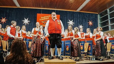 Zur zweiten Halbzeit nahmen dieses Jahr 72 Musikanten der Stammkapelle auf der Bühne Platz.